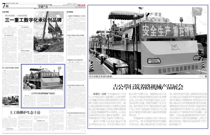 展示會(huì)得到諸多網(wǎng)絡(luò)媒體紛紛報(bào)道的同時(shí),主流媒體平臺(tái)《中國(guó)交通報(bào)》也于2013年7月22日第七版對(duì)此次展會(huì)進(jìn)行了報(bào)道,高度肯定了森遠(yuǎn)、吉公在綠色筑養(yǎng)路行業(yè)新發(fā)展形勢(shì)下的旗幟作用,充分見(jiàn)證了森遠(yuǎn)、吉公以諸多代表性產(chǎn)品服務(wù)市政道路建設(shè)、贏得行業(yè)市場(chǎng)、獲得用戶(hù)認(rèn)可的不爭(zhēng)事實(shí)。